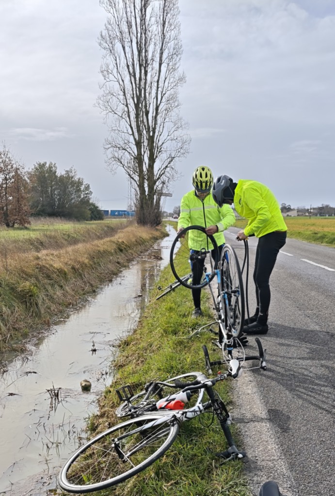 Allez après un si bon ravitaillement on pouvait espérer que la malédiction changerait de maillot ,mais non! Nouvelle crevaison et cyclo supposé perdu mais en réalité pas perdu et autre cyclo supposé pas perdu, mais perdu, vinrent s’ajouter à la déjà longue liste.