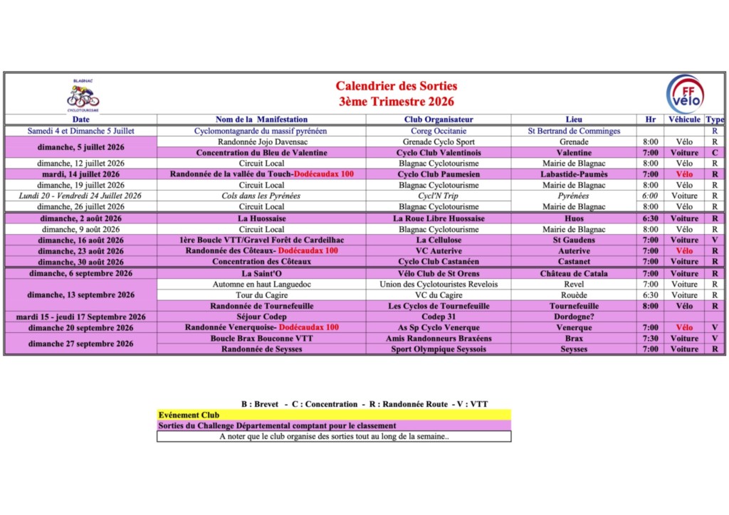 La randonnée étant un peu longue 80km+, le Rdv à la mairie de Blagnac est à 8h30 pour départ à vélo.