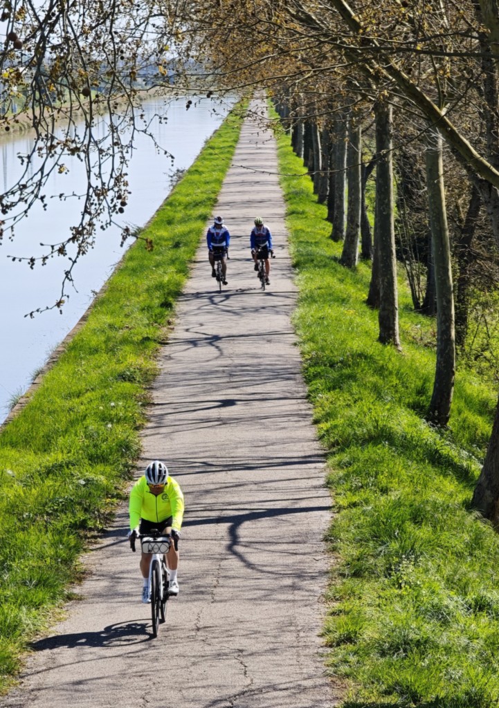 Le parcours, comme la saison nous y invite, pratiquement plat , avait permis de rejoindre Grisolles via Merville et Aucamville (82), le retour par le chemin de halage du Canal Latéral à la Garonne ne posait strictement aucune difficulté de navigation et offrait des conditions de sécurité qui permirent de rouler à deux de front et de longuement échanger. C'est aussi cela la convivialité.