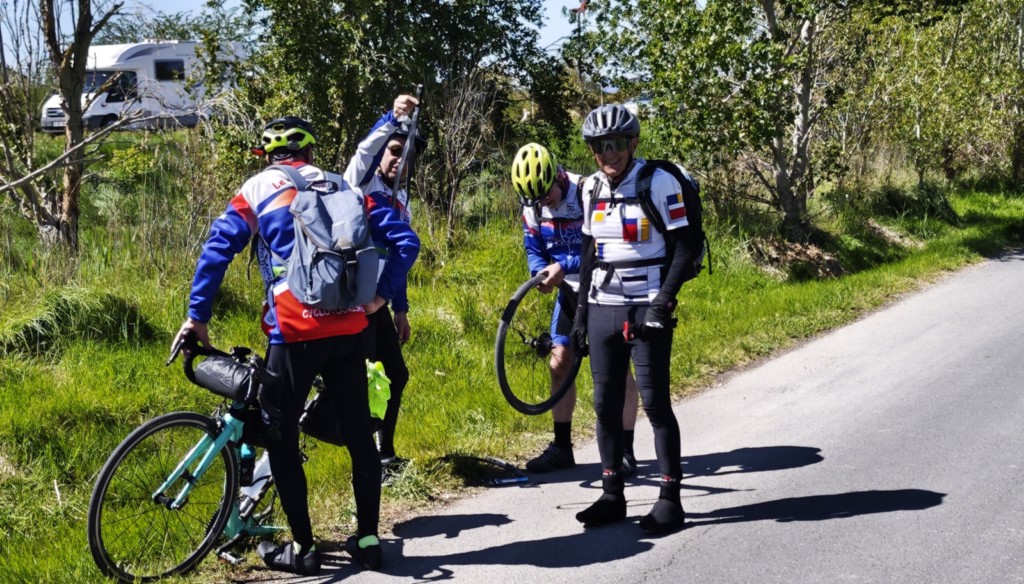 Allez après un si bon ravitaillement on pouvait espérer que la malédiction changerait de maillot ,mais non! Nouvelle crevaison et cyclo supposé perdu mais en réalité pas perdu et autre cyclo supposé pas perdu, mais perdu, vinrent s’ajouter à la déjà longue liste.