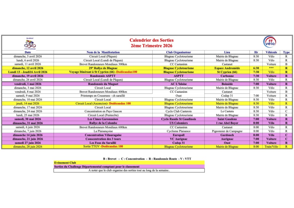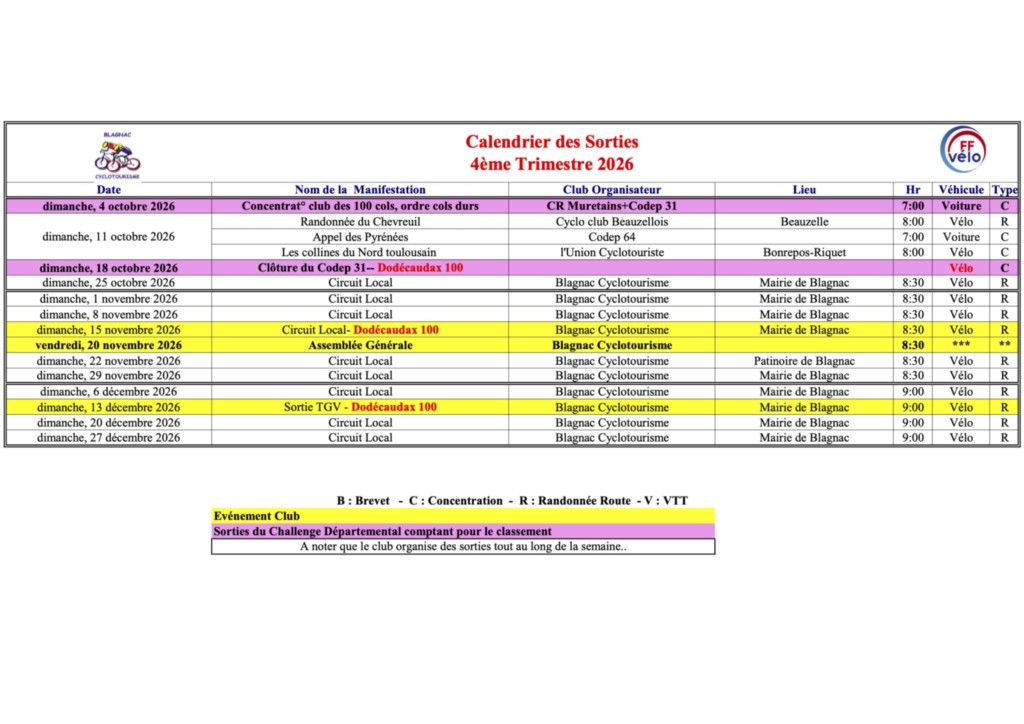 La randonnée étant un peu longue 80km+, le Rdv à la mairie de Blagnac est à 8h30 pour départ à vélo.